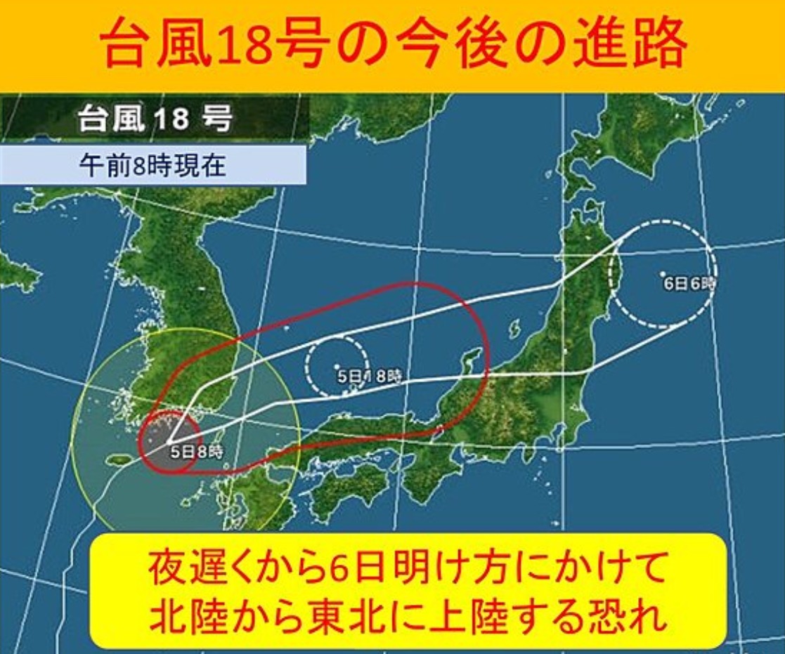 台風18号は、昼前には対馬海峡に進み、その後、台風は速度を早め、暴風域を伴ったまま日本海を東へ進むでしょう。5日夜遅くから6日明け方にかけては、北陸地方から東北地方にかなり接近し、上陸するおそれがあります。