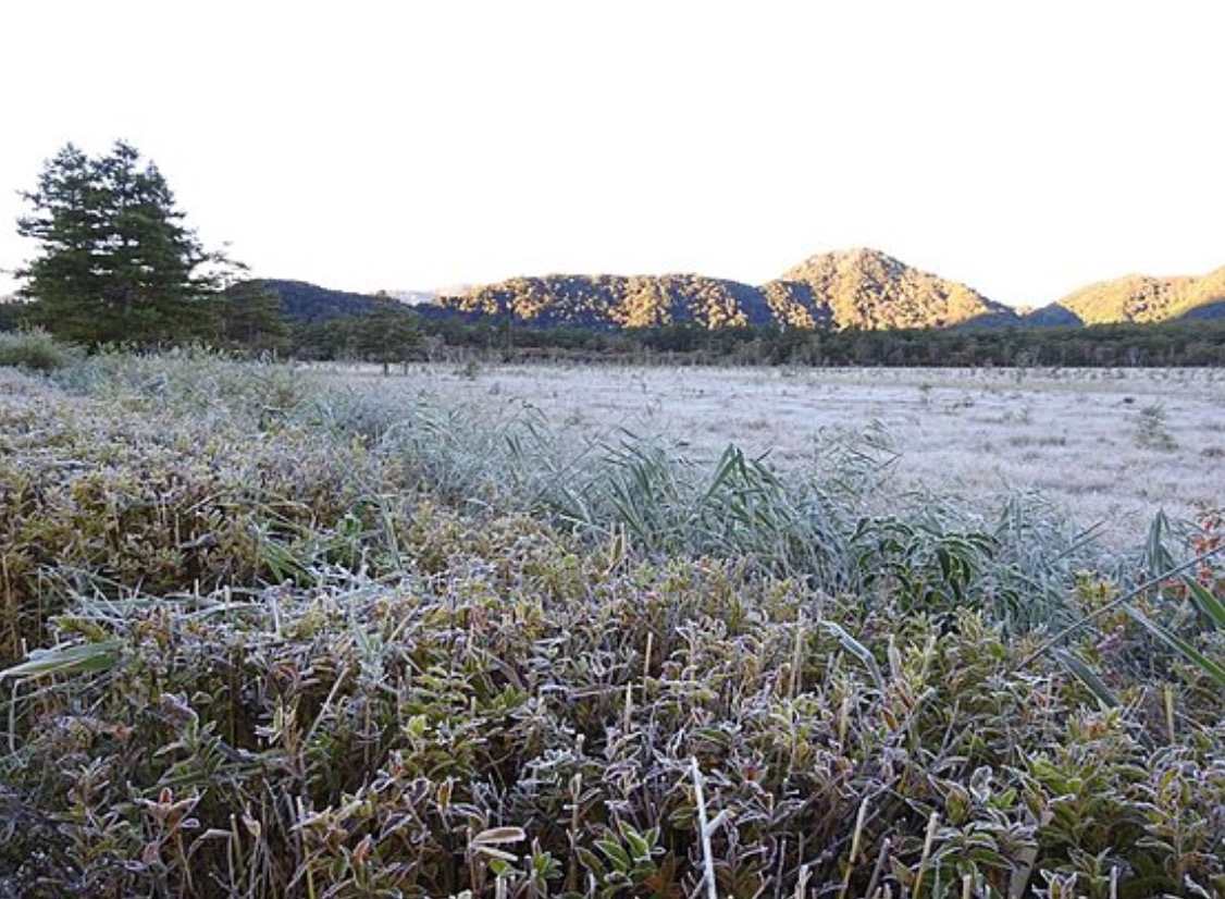 栃木県奥日光の戦場ヶ原(標高約1400m)で、約40年に渡って気象観測を続けている鶴巻正男さん(土産物店 三本松茶屋店主)によると、昨夜遅くから今朝にかけてスッキリと晴れて放射冷却が強まったということです。今朝6時までの最低気温は氷点下2度5分と、今シーズンで最も低くなり、初霜と初氷を観測しました。